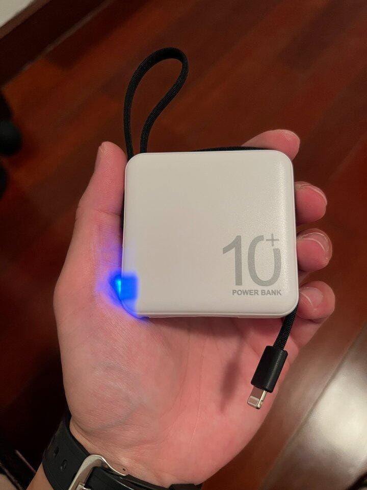 This is so convenient! Small enough for sports pants pockets, no need to find a place to put it when chargingone hand works. I cant live without it now, highly recommend!