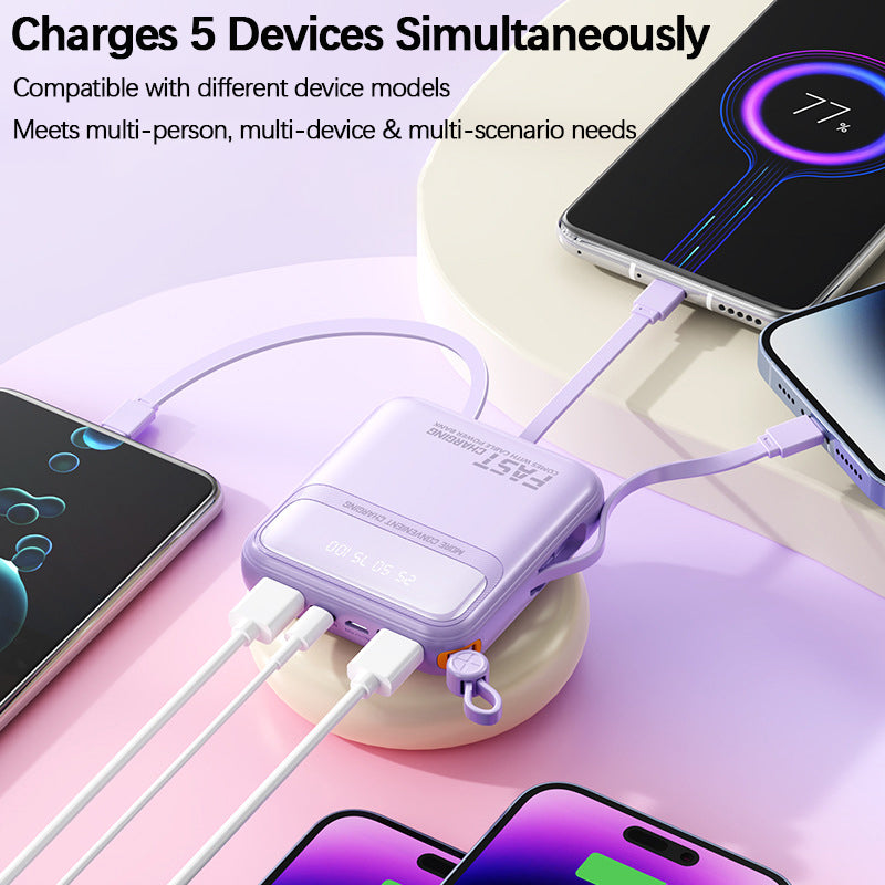 • All-in-one Charging: With four built-in cables, it eliminates the need to carry extra cables and meets all charging needs.