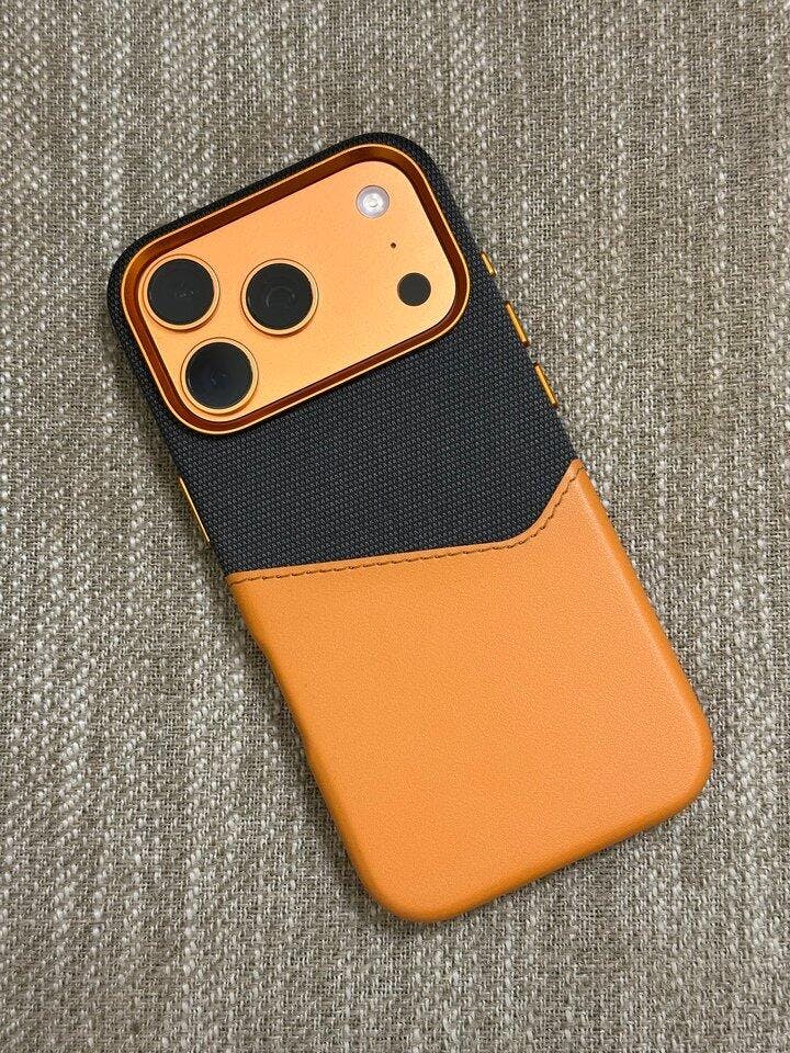 It has a nice texture to the touch. The orange part below is made of leather, and you can also put a card inside. The quality is really excellent!